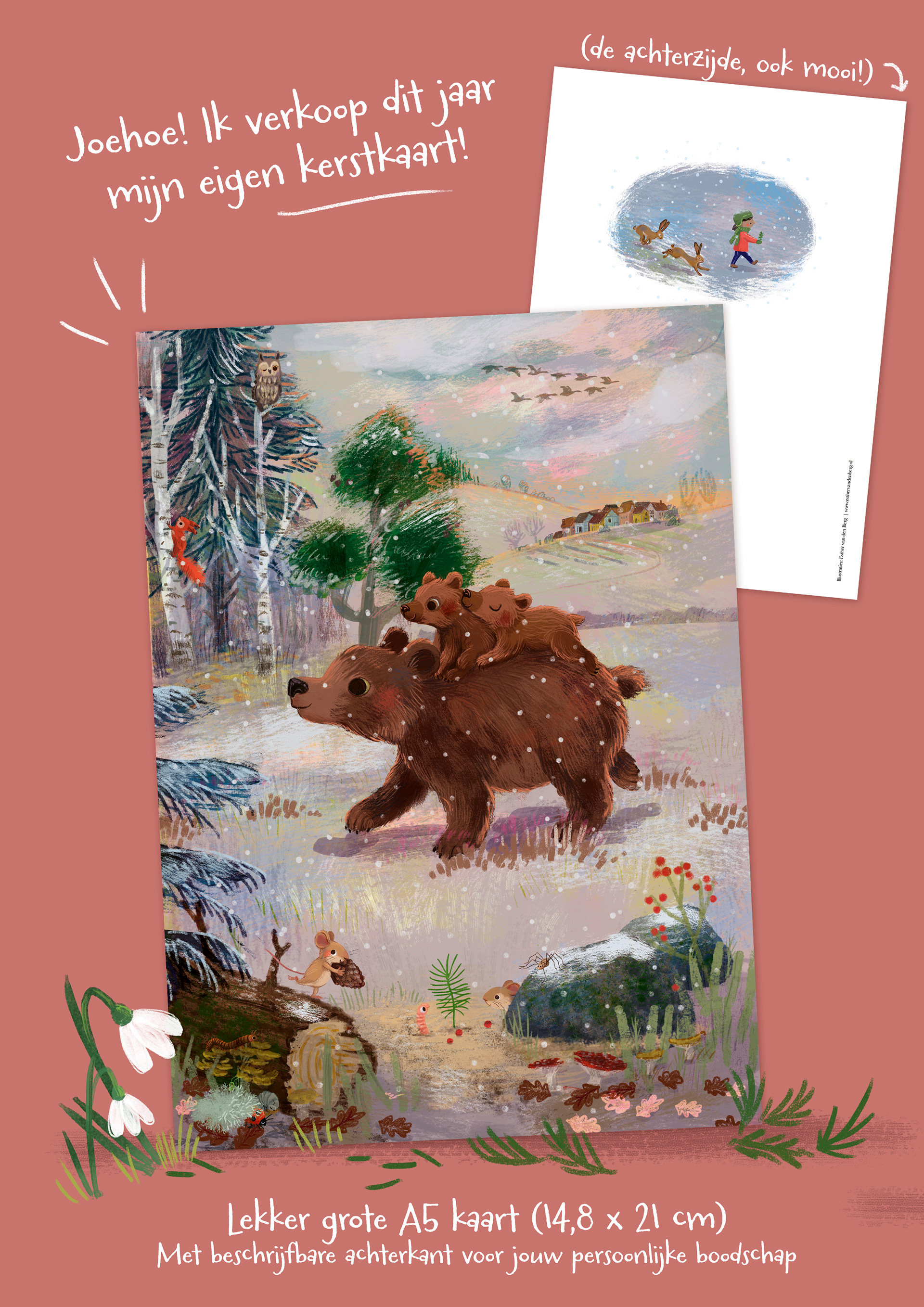 Op de voorzijde één van mijn favoriete illustraties uit mijn prentenboek 'Op weg naar kerst'. De achterzijde heeft een lieve, kleinere illustratie en genoeg ruimte voor jouw persoonlijke boodschap.